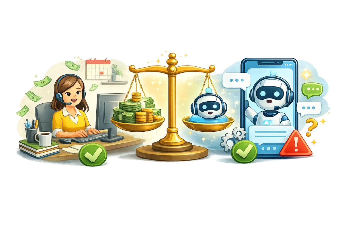 A full-time human receptionist typically costs upwards of $3,000 to $4,500 USD per month once wages, payroll taxes, benefits, training, sick time, and coverage gaps are considered.